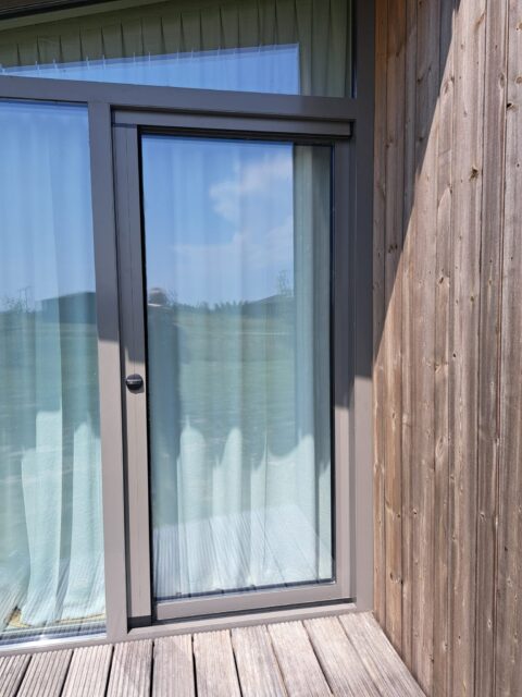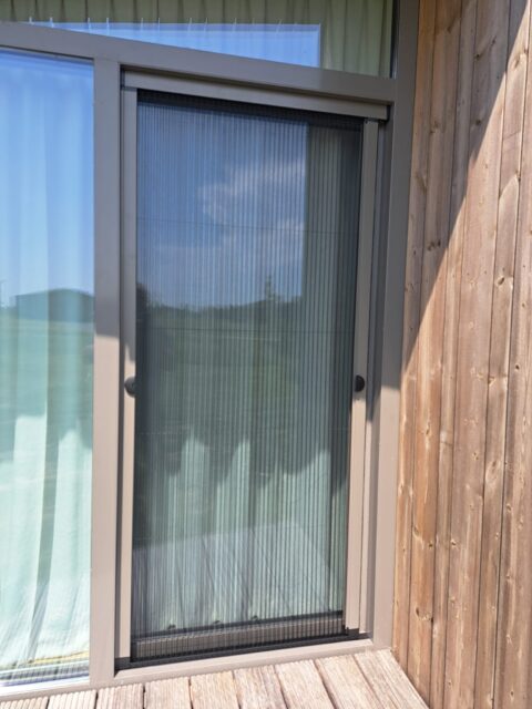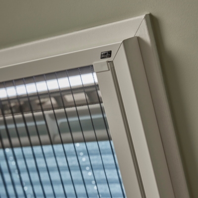 PlisséFit hordeur in RAL7039 mat structuur, passend bij de kozijnen.